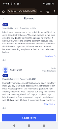 Read moreWe arrived at the hotel after midnight due to our train schedule. I called the hotel at 2:00 PM to confirm that we would be arriving late at night.||When we arrived, we had to pay a €100 deposit in addition to the city tax.||The receptionist informed us that our room was on the seventh floor, but that the elevator only went up to the sixth, so we would have to take the stairs for the last floor. He also told us that we would need to leave the room key at the reception every time we left.||At the time, I found it strange, but since it was already very late, we went up to the room.||Upon entering the elevator (which was very old), it couldn’t fit both me and my boyfriend together. I had to go up first. When I arrived alone, there was a man sitting on the stairs in front of our room, in the dark. I was startled and waited by the elevator door for my boyfriend.||After he arrived—since only one person could go up at a time with luggage—he took the stairs and found the room open.||When we entered the room, we saw it was awful! The toilet was broken. The shower enclosure was only partially installed. The bed was dirty and messy. The decorative lights above the bed were all crooked. When we opened the wardrobe, the pillows were thrown on the floor.||In short, it was impossible to stay in a hotel like this! We immediately went back down and informed the receptionist that we would be leaving right then to find another hotel.||When I spoke to the receptionist, he told me I wouldn’t be able to get my deposit back (€100) unless I returned to the hotel in person the next day.||When our Uber arrived to take us to another hotel, the laundry staff had left a large cart in the middle of the hallway with huge bags of clothes on the floor, blocking our way out. We had to struggle to make our way to the car.||Because of all this, I do not recommend this hotel. Terrible! I hope I can...