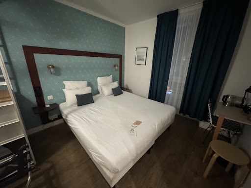 First clocked on when we got to the lobby to check in. There were a bunch of plants, but they were all fake. I had booked a standard double room with a single queen bed, and had made sure to request one big bed in the booking. The attendant who checked us in even confirmed this. Got to our room, which turns out had two single beds, on individual frames with wheels, pushed together. Not exactly ideal for a romantic getaway to Paris. The beds kept coming apart with someone falling in between. The room was fine, but the attention to detail was lacking. Lots of wear and tear. Since we checked in late in the evening, I left the bed thing for the moment. The next morning I talked to the receptionist, and said how I had requested on big bed but had received two twin beds, and if there was anything we could do about that. He was very helpful and swapped rooms. But turns out their idea of one big bed, are pushed together smaller beds. As the room we changed to had the same issue of the smaller beds on wheeled frames coming apart. The second room was also a little more worse for wear. The luggage rack was missing a big chunk of fabric in one strap, the sink had a giant crack in it, the shower head couldn't stay up, the soap holder was broken, stains on bedding. These things are all fine, and didn't effect our stay that much, but when you see a hotel is "4 stars" and is presented a certain way online, it is disappointing to see all that. Aside from actually being unable to share a bed with my partner, I slept ok.