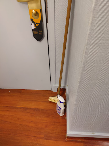 We immediately requested another room at the front desk when we expressed how filthy the room and bathroom were. There were excrement stains on the bottom of the toilet seat and hairs left all in the shower as if neither had been cleaned in days. The receptionist's response was to laugh and flippantly reply "only a few hairs?". We requested someone come clean the room and were told no one was available. Ultimately we asked for cleaning supplies so we could do it ourselves. Initially he couldn't find any cleaning supplies (we thought that fit the scenario), and when he finally found anything for us, it was a small push broom (what?) and a bleach spray with 1 rag. See the pictures.