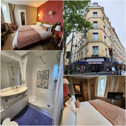 Read moreMy 20 year old son and I spent eight nights at the Hotel Welcome in mid-August 2014 when we were visiting from the U.S. The hotel was well maintained and clean. We reserved a room with two twin beds and found that one of the beds was actually a double; I presume that the layout was designed for a parent-couple and a child. There was a small but very clean and modern bathroom in the room with the only odd thing being that the shower was pretty small and did not have an enclosure on one end due to space limitations. However, there was one of those movable hand-held shower spray attachments and it made it pretty easy to shower without hosing the bathroom. They also had a tiny elevator that went between floors. We were on the 5th floor (room 55) and if we looked out the window we could see the Eiffel Tower. There were about 10-11 rooms per floor. Continental breakfast was available for an additional fee, but each morning we simply walked a block to one of the several bakeries and purchased a selection of rolls and coffee for half the cost. The hotel staff at the front desk were cheerful and friendly. As for location, the Hotel Welcome is pretty hard to beat. We were just a few blocks from Notre Dame, the Musee' Rodin, Place Invalides, the Concierge, etc. it was nice to be just a couple of blocks away from the multitude of sidewalk cafe's in St. Germain without, with their bustling tables, evening strollers, street musicians, sidewalk creperies, etc. without having them right at the entrance to our hotel. So were very close, but a bit more quiet. The Latin Quarter with all of its restaurants, etc. is just a few blocks NE, near the river, and this was also convenient. I would go to the Hotel...