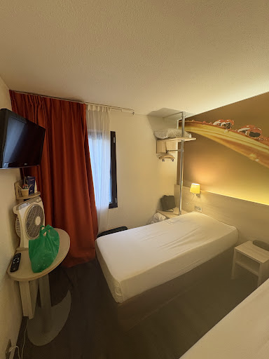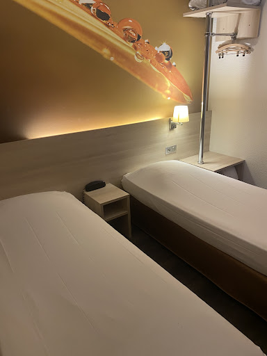 Read moreEn una palabra: Terrorífico. En la recepción apenas hablan inglés, nada raro en Francia. A las 22:00 se van y no queda nadie del staff, pese a que se trata de un hotel grande y este día estaba completo. Habitación minúscula, apenas pueden andar por ella dos personas a la vez sin golpearse con algo. Nada más entrar te recibe un apestoso olor a cañería proveniente del baño. Cisternas muy ruidosas, cada vez que alguien en una habitación tiraba de su cadena nos enterábamos todos. Manchas color marrón en la cama repartidas por todas las sábanas, también manchas en las toallas. De 3 lámparas que había en la habitación 2 no tenían bombilla. El baño con gotas de suciedad por todo el lavabo y el grifo. Arañas colgando por las esquinas. Ducha con cortinas de plástico que tenían toda la parte inferior color marrón de haber sido usadas durante años sin lavarse. El secador estaba pegajoso e incrustado en la pared. Tuvimos encima mala suerte y nos tocó la habitación al lado de la puerta de acceso al pasillo y cada vez que alguien entraba o salía oíamos los pasos y el golpe de la puerta al cerrarse. También cogimos el desayuno ya que habíamos leído que estaba muy bien, que era variado y completo... y resultó ser lo más decepcionante. No os fiéis de las fotos que tienen publicadas con varias opciones de zumos, bollería, salados y demás, son mentira. Solo había un tipo de zumo de naranja y no era natural, de salado solo había lonchas de jamón cocido, 2 quesos y un huevo para cocerte tú mismo. Opciones dulces muy escasas también. No merece la pena pagar los 9 y pico euros por persona que cuesta el desayuno. En fin, alojamiento carísimo para el pésimo servicio que ofrecen, deberían dejarlo en un hotel de 1 estrella y pasarles alguna inspección de higiene y salud porque cosas así no se...