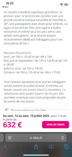 Read moreNous avons séjourné au camping du 02/07 au 05/07, nous avons loué avec un propriétaire directement mais nous avons choisi de prendre les funpass pour pouvoir profiter des activités proposées notamment piscine, toboggans, restaurants et autres activités. Concernant le mobil home : rien à dire c’était propre, spacieux et bien équipé, nous avons passé un agréable séjour dans celui-ci. Par contre nous sommes déçus par les services du camping. Nous avons payé nos funpass en tarif haute saison, nous pensions donc pouvoir profiter de la piscine jusqu’à 19h30 en juillet comme indiqué sur le site, finalement la piscine fermait vers 18h/18h30. Nous n’avons donc pas pu aller nous baigner autant que nous l’aurions souhaité. De plus les toboggans n’étaient pas ouverts. Nous avons donc demandé à la réception les horaires d’ouverture des toboggans, la personne nous a dit qu’ils les ouvraient qu’en haute saison et que pour l’instant nous avions bénéficier du tarif moyenne saison donc qu’il y avait moins de services ouverts, pourtant après vérification je me suis aperçue que nous avions payé en tarif haute saison ! J’ai donc demandé des explications à la personne de la réception concernant le paiement des pass en tarif haute saison, elle me dit que c’est parce que nous sommes arrivés le 02/07 et que la haute saison débute le 01/07 mais qu’ils ouvraient les toboggans que le 05/07. Pourquoi changer le tarif si vous ne proposez pas tous les services de la haute saison ? J’explique alors à la réceptionniste que j’ai le sentiment que nous avons été victime d’arnaque, elle me dit que ce n’est pas une arnaque car sur le site internet les dates exactes d’ouverture des toboggans sont mentionnées et qu’il fallait lire. J’ai cherché sur le site, tout ce que j’ai vu c’est que les toboggans ouvraient en juillet-août, nous étions en juillet ! Les dates que me donnait la réceptionniste ne sont pas mentionnées sur le site contrairement à ce qu’elle affirmait ! (Voir image en pièce jointe) Je considère donc que votre publicité est mensongère car pour 62,40€ (pour 2 adultes) nous n’avons pas pu profiter des services que nous pensions disponibles en juillet et qu’il n’y avait pas beaucoup d’activités à notre goût… si nous avions su les réelles horaires de fermeture de la piscine et que les toboggans étaient fermés nous n’aurions pas pris ces pass ! Voire nous aurions réservé dans un autre camping… Nous avons uniquement profité de la piscine pendant 2h, vu le tarif on aurait mieux fait d’aller en piscine municipale… De plus les toboggans devait ouvrir le jour de notre départ d’après la réceptionniste (donc à 10h si on regarde les informations du site) quand nous sommes partis à 10h15 ils n’étaient pas ouvert… En résumé si vous louez avec un propriétaire juste avant les périodes d’affluence et que vous ne souhaitez pas passer l’entièreté de vos journées au camping, je ne conseille pas de prendre les fun pass car j’ai trouvé qu’il n’y avait pas un bon rapport qualité/prix au vu des horaires de fermeture de la piscine et du nombre...