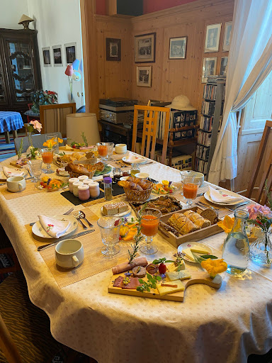 Le petit-déjeuner était copieux, varié, préparé avec beaucoup de soin : charcuterie, fromages, café, jus de fruits, yaourts, pain et confitures maison, le tout dans un cadre paisible, accompagné d’une douce musique d’ambiance. La salle à manger, avec sa grande fenêtre donnant sur le jardin, invitait à la détente.