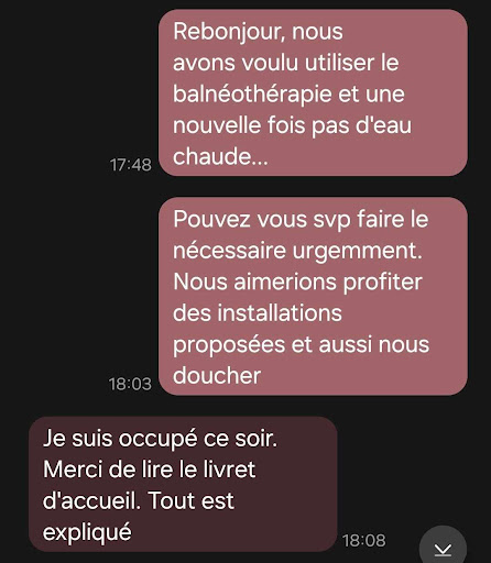 Le lendemain matin, nous avons pu prendre une douche avec une eau tiède, mais le soir, en voulant retenter la balnéothérapie, plus d’eau chaude à nouveau. Et, encore une fois, aucune réponse du propriétaire… Nous avons donc dû terminer notre séjour avec de l’eau froide, ce qui est loin d’être l’expérience attendue dans un logement de ce standing.
