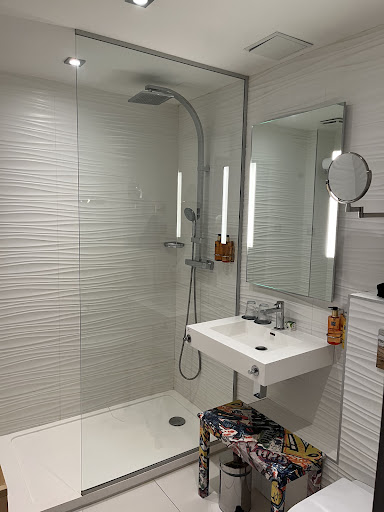 Du shampoing et gel douche sont disponibles en flacons près du lavabo et dans la douche où se trouve aussi un tabouret bas. Un sèche cheveux est fourni ainsi que des mouchoirs en papier. Si cette pièce bien éclairée est assez spacieuse il y a en revanche assez peu de place pour étaler ses affaires autour du petit lavabo en pierre.