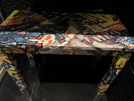 La décoration est soignée avec notamment une jolie commode faite comme un empilement de valises et un étonnant fauteuil extra large comme un trône. La couleur dominante est le gris anthracite.
