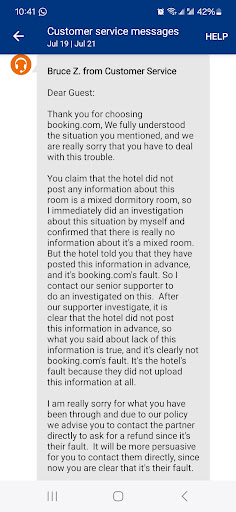 Read moreIt was a suck booking experience. I made the reservation from Booking.com. However, the hostel didn't mention that it was a mixed room on the platform. After I finished the reservation, I got the information by email and realized that it was a mixed room. Then, I immediately contacted the hostel for a cancelation and refund, but got rejected. The hostel said it was Booking.com's fault and asked me to argue with Booking.com. However, based on the results of Booking.com's servey, it's the hostel who didn't put the information on the platform at all. Booking.com also helped me to ask for the cancellation and refund, but the hostel still rejected it. I totally do not recommend the hostel. If you want to book it, make 100% sure you would not encounter any problem before, when, and after the stay, or you can foresee how the hostel deals with problems according to my case: no matter whether it is the hostel's fault, it won't give...
