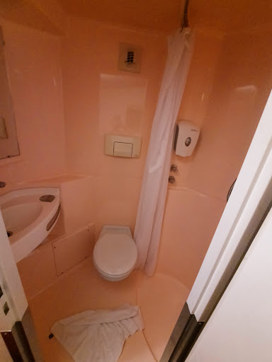 The bathroom - the room where one attempts to become clean in spite of the mouldy shower curtain and inhabited cracks - is a horror show. It's impossible to take a shower without kicking the toilet on the way out, but try, because there seems to be a risk of disease upon contact. Speaking of which, I don't want to know what the stains on the toilet are. There is hot water, but you must choose between scalding or freezing.