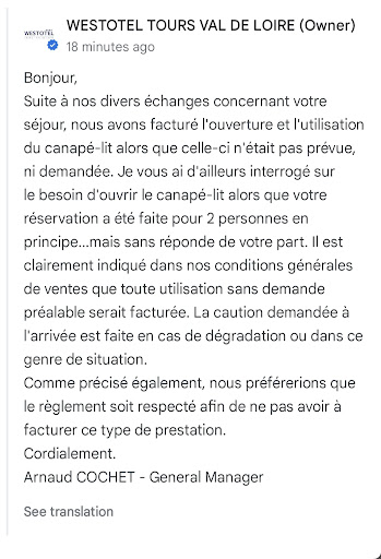 Revenons au personnel. Que dire si ce nâest que tout fut parfait encore une fois (et pourtant pour taquiner, jâaime ĂȘtre tatillon). Mais lĂ le personnel est Ă lâĂ©coute, sans chichis inutile. Vraiment une belle approche, que vous soyez chef dâentreprise, une famille de passage ou les deux en mĂȘme temps, ils sauront sâadapter !
