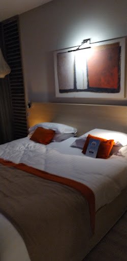 Read moreNous avons passé 2 nuits dans cet hôtel.||Emplacement:|On savait que l'emplacement de l'hôtel était situé dans une zone avec beaucoup de circulation de voiture mais on n'avait pas fait attention que le train passait à côté. Après ca reste de notre faute, nous n'avons pas fait attention. La bonne surprise fût qu'on a dû entendre le train une ou deux fois max. Le bruit n'était vraiment pas dérangeant.||L'hôtel est à 2min du centre ville en voiture donc parfait. Je crois qu'il y a la possibilité de louer des vélos.||Le parking est bien et sécurisé.||L'hôtel:|Bon, l'extérieur c'est pas trop ça, j'ai connu mieux en 3* mais ce n'est que l'extérieur.|L'intérieur est bien, propre, calme, accès sur la salle du petit déjeuner. très lumineux.|Couloir et ascenseur propre.||La chambre:|Nous avons réservé la chambre double Supérieur Pour Femme car elle nous paraissait très cosy sur les photos. |bonne surprise la déco est vraiment sympa, la chambre est grande, il y a un balcon, la literie est plutôt bien. On peux regarder netflix via le chromecast de la télé (attention, suivant votre abonnement netflix, il n'est pas forcement possiblie que vous puissiez le faire et ce n'est pas la faute de l'hôtelier)|Par contre pleins de petits points négatifs: des bibelots qui prennent la poussière, très peu de rangements (une penderie et 2 étagères prises par des bibelots et théière originale mais un peu cheap...)|Pas de café, uniquement du thé.|La salle de bain est grande mais manque de rangements. Un meuble à la place de la chaise aurait été mieux.|Pas de brosse WC, sèche-cheveux pas très puissant (faut pas être pressé si on a de long cheveux) |concernant la baignoire/douche, pas top, le pommeau de douche ne tient pas bien sur la barre de douche, 0 étanchéité avec le pare douche (environ 1 cm d'espace entre le pare douche et la baignoire donc de l'eau sur le sol). on aurait préféré une douche.|Il y avait une partie de la peinture qui partait au niveau de plafond dans un des angles de la salle de bain au niveau de la douche.||Le petit déjeuner:|Rien a redire, c'était parfait, beaucoup de choix.||Le personnel:|Nous avons été accueillis par Timothée, personnel très sympathique et professionnel.|Le reste du personnel était également très agréable, il n'y a rien à redire.||En conclusion, rapport qualité/prix, déçu de la chambre qui est une chambre supérieure 4. Nous avons connu une chambre standard 4 et elle vaut bien mieux que celle-ci.|Elle reste dans la lignée des chambres supérieure 3* que nous avons pu faire.||A refaire, on n'aurait pas pris...