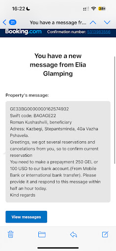 Read moreI had a reservation for the property and received a message via Booking.com a few days before, asking me to pay USD 100 before my arrival. This would have been fine, but the message demanded that the money be paid within 30 minutes. I did not see the message until later that day. ||I transferred the money later in the evening (to the bank account requested), but I received an email the next morning saying my booking had been cancelled. ||I contacted the property again and sent screenshots of the payment, explaining that there would likely be a delay given it was an international bank transfer. I then received a number of abusive whatsapp messages from the owner (who’d found my number from Booking.com). The booking remained cancelled. ||After much argument via Booking.com, the property finally agreed to refund me the USD 100, but I had to travel to a random property in Kazbegi to collect it in cash. ||This was not a one off. A friend cancelled their booking after hearing my experience and was then subjected to anti semitic messages from the owner via whatsapp....