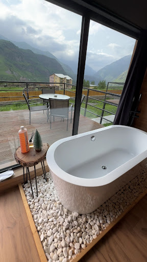 The design of the cottages is stunning. The wooden interiors create a rustic yet elegant vibe, perfectly blending with the natural surroundings. The bathtub, set in front of a large window, offers a breathtaking view of the Kazbegi mountains. Soaking in the tub while gazing out at the serene landscape was a highlight of my stay. The gallery bedroom also provides a spectacular view, making waking up each morning a truly magical experience.
