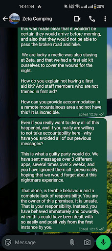 He didn’t. In fact, he ignored every message we sent. Emails, WhatsApp, phone calls - nothing. We weren’t even asking for compensation at first, just basic accountability and a refund for an objectively unsafe stay. Total silence. Eventually I contacted him from a different number, posing as a new guest. He replied within minutes. When I revealed who I was and explained what had happened, he denied it and even called me a liar. He said no injury occurred. When I offered photos of the wound and the stitches, he stopped replying.