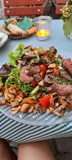 Das Rumpsteak, wenn es überhaupt eines war (kein typischer Fettrand und sah eher nach einem günstigerem Hüftsteak aus), war leider sehr schlecht gebraten. Die einer Seite war sehr lange auf dem "Grill" und die andere Seite sehr wahrscheinlich nur max. eine Minute. Dies führte dazu, dass eine Seite eine sehr harte Fleischkruste hatte und die andere Seite gar keine Röstaromen besaß. Dadurch wurde das Fleisch wohl auch so zäh. Die hier verwendete obligatorische Rucola Dekoration, wie bei der Spargelsuppe auch, hätte man sich beim anrichten sparen können.