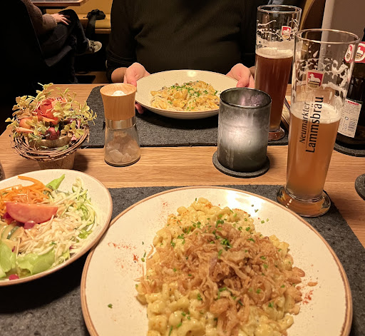 If you are vegan or vegetarian or if you prefer organic only food, then Bayerische Wirt is the place for you - the restaurant specialises in healthy home cooked fare - but also serves meat (and the goulash is excellent). The continental breakfast buffet had a lot of healthy choices as well (but cappuccino as well).||||The hotel owners clearly believe in crystal power. There are crystal lights in every room, crystals in the water urn and the bricks around the lobby are blocks of quartz. The room was large and quiet. The bathroom had organic amenities as well. Shower only, no bath.||||There is a a small play ground for children which my daughter loved. There is disabled / pushchair access via a large lift to the bedrooms. The hotel is within walking distance of the number one tram which goes direct to the Rathaus Square in the city centre every ten minutes in about ten minutes. ||||There is a coin laundromat within walking distance as well (Canbolat at #40 Blucherstrasse). The staff are friendly and we...