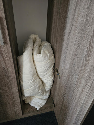 Im Zimmer setzt sich der negative Eindruck nahtlos fort: Das bereitgestellte Wasser weist ein beschädigtes Garantiesiegel auf – wer hier noch Durst hat, trinkt mit Mut zur Lücke. Die Bettwäsche ist mit deutlich sichtbaren Stockflecken versehen, und die Matratze ist so stark durchgelegen, dass man in einer tiefen Kuhle liegt – ein absolutes No-Go für jede Unterkunft, die einen gewissen Anspruch erhebt.