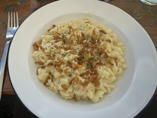 Read moreNach dem Abstieg vom Hochfelln Gipfel, war eine Stärkung angezeigt. Wir hatten Kasspatz'n (Käse-Spätzle) und ein Speckbrettl.. beides war hervorragend und hausgemacht. Allein die Spätzle waren an frische und Schmelz kaum zu überbieten, Fluffig, zart und einfach herausragend. Die Johannisbeerschorle sorgte für zusätzliche Genussmomente, schmeckte diese ebenfalls hausgemacht und frisch. Auch der Hausmacher Zirbenlikör (Likör aus Zirbelkieferzapfen und -samen) schmeckte hervorragend, wenn man den holzig, harzigen Geschmack liebt. Als Dessert war der Hausmacher Schmandkuchen ebenso ein Genuss, wie der frische Sennerinnen Salat oder der hauchdünn geschnittene Speck oder Hausmacher Bergkäse.
