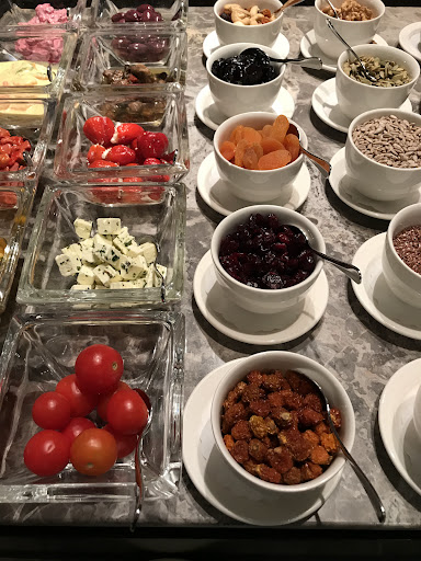 ROOM: We were given room 903. It was a fairly large suite, close to 700 sq ft, with separate bedroom, living/dining area, and kitchen/entrance area, plus a sizable bathroom. The only small complaint was that the bedroom area is fairly small, so the only space to open our suitcases was in the living area. The room was at the northeast corner of the building, so we had views of the Sony Centre and its roof, and could see all the way to the Fernsehturm (TV tower). The living/dining area was great for entertaining (can seat/fit a dozen people comfortably). The décor of the room was quite nice, sleek and modern, though it lacked some of the modern touches that I expected of a top tier hotel (such as USB plugs, electrical outlets at work desk.) The wifi in the room worked well. The king size bed was comfortable. The bathroom was large and functional, with lots of counter space. Overall, the room was comfortable and homey, felt like staying in an upscale apartment.
