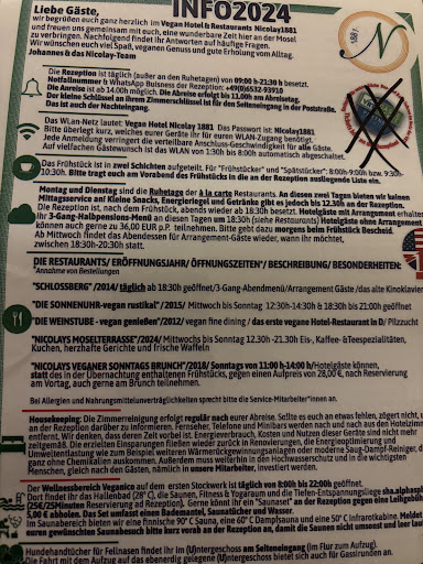 If you need Wifi everywhere, newly renovated rooms with a modern touch and the general look and feel of a big chain hotel - you'll be disappointed.||||If you like good food, good wine, a nice spa area and an inimitable experience - you'll be more than satifsfied.||||At hotel nicolay, 1860 meets 1881 meets 1900 meets 1990 meets 2020.||The family run hotel is full of little glimpses into its long past and in constant change.||||While the quite big SPA Area looks like a small modern and tastefull wellnes club, the dining hall hasn't really changed much since 1960. You'll be served coffee from a coffeepot and you'll dine with silver cuttlery.||||The stairway thou looks like 1950 and the elevator looks like 1970 from the outside and 1990 from the inside.||||The owner is also the chef and he and his girlfriend mainly run the restaurants. They are supported by his parents. Both generations compete at a game of "who's the most funny and charming" and they are both winning.||You won't get the fake smile you know from big hotels but you'll get honest hospitality instead.||||Foodwise you can choose between vegan fast food or vegan top cuisine with dishes like "Smoked avocado with quinoa chia seeds in a lemon capellini coat||with garlic and herb tomatoes".||The Breakfast ist lavish and full of suprises like vegan salmon made from carrots or self made vegan mozzarella.||My mom has been a meat eater her whole life and she was amazed at how much she loved the food. If you're not vegan, do not be affraid.||Your tastebuds will be more than staisfied.||||The wine - weather you're vegan or not - is a unique experience as well. The Hotel is supplied by a local (500m down the street) vegan winery that hand picks and sorts the grapes for its wine. The old owner talks about grapes like other people talk about their children. This wine definately is made with love.||And since it is not filtered using animal products but instead uses had sorted grapes - it doesn't have any rotten grapes in it and thus leaves you without any headaches.||||The area is great for running, cycling, hiking and walking.||Or for just strolling thru the tiny old town along the river.||||We've been there as a couple and loved it, we returned as a family with a two year old child and my mother and loved it as well. And we'll definetly come back...