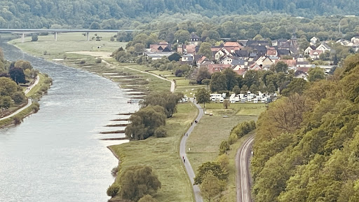 Wenn da nicht…. Diesen wunderschön gelegenen Stellplatz können wir - mit einer Einschränkung - voller Überzeugung empfehlen. Auf einer gepflegten Wiese unmittelbar Ufer der Weser gelegen, hat man gleichzeitig idyllische Aussicht auf die Abtei und die Burg am gegenüberliegenden Ufer. Der Weserradweg wechselt hier die Seiten per nostalgischer Fußgänger Ziehfähre. Der Weser Skywalk ist fußläufig durch urigen Wald gut erreichbar. Entdeckt hatten wir den Platz auf einer Radtour und haben uns spontan für den nächsten Tag angemeldet, nachdem wir im Gartenrestaurant saßen und etwas bestellen wollten. „Die Küche ist zu“ statt „guten Tag“ schallte es uns entgegen ohne weitere Fragen nach Getränk oder ähnlich. Als meine Frau dann höflich nach vielleicht Kaffee und Kuchen fragte, wurde uns diese Option dann widerwillig zugestanden. Alles mit einem Blick, der schon fast Angst machen konnte. Ein Hotelzimmer hätten wir daraufhin sicher nicht gebucht, aber der Stellplatz war einfach zu einladend. Dieser gehört zu dem Hotel und die Anmeldung erfolgt über die Rezeption. Die Toiletten können dort genutzt werden. Aber auch das Restaurant mit schönem Außen-/Gartenbereich( naja, vorsichtig. Wir haben es dann bewusst gemieden) Ver- und Entsorgung ist gegeben. Für diese Lage und Ausstattung empfanden wir den Preis als günstig. Wenn eben nicht…die Wirtin wäre, die als Inbegriff der Unfreundlichkeit und Umgastlichkeit gelten könnte: verabredungsgemäß erreichten wir dann am nächsten Zag den Platz um uns an der Rezeption anmelden. Die Chefin ging gleich in Abwehrhaltung und teilte uns mit, dass ihr Mann gerade duschen sei und wir warten müssten. Sie kenne sich auf dem Platz nicht aus, das mache alles ihr Mann kam es sehr barsch aus ihrem Mund. Aufgabenverteilung ist ja okay. Urlaubsmäßig entspannt erlaubte ich mir die Frage, wie lange es etwa dauern würde um entweder im Wagen zu warten oder vielleicht doch eine Runde spazieren gehen sollten. „Das kann dauern - haben Sie denn reserviert?“. Zumindest fand sie unseren Namen in der Liste!! Der zum Glück freundliche Chef kam dann auch und wies uns den schönen Platz zu. Fazit: Platz empfehlenswert aber bitte nicht von der Dame...