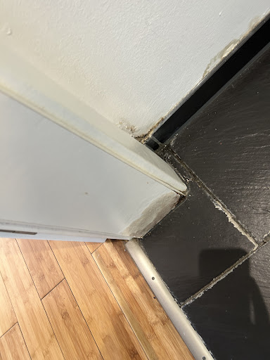 Dusche und Waschbecken Abfluss verstopft, Waschbecken fehlen Abflussabdeckungen, es stinkt höllisch. Auf dem Boden lagen Krümeln und Apfelstücke.