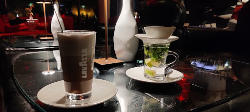 A coffee station where you can make cappuccinos, espressos, or black coffee, and a selection of tea leaves with strainers and hot water.
