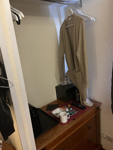 Übrigens habe ich jetzt erst… heute Morgen… die Kleiderstange entdeckt. Schrank? Fehlanzeige. Die sicher nach 12 Std Anreise nicht mehr ganz so… „taufrische“ Bekleidung hängt also dann ÜBER DEN LEBENSMITTELN 🤢sprich Kaffee& Tee- Automat 🫣