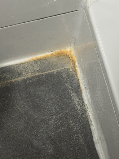 Das Badezimmer war der absolute Tiefpunkt: Roter Schimmel in den Ecken, verdreckte Spiegel, eine Toilette, die offensichtlich nicht gereinigt wurde (inklusive sichtbarer Urinreste vom Vorgänger), und eine Dusche, die man nur mit viel Mut betreten konnte – der Abfluss war komplett verschimmelt, was stark auf Schimmel- und Pilzbefall hindeutet.