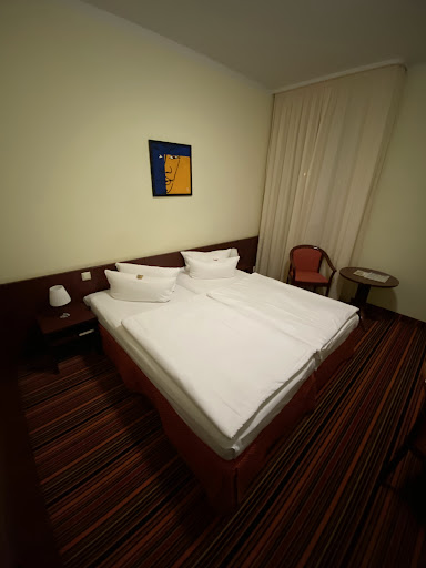 In our opinion this is not a 4 star hotel. There are services and elements which is generally associated with a 4 star hotel such as room service, mini bar and air condition. But the rooms are definitely nothing more than standard. The furniture is old looking although the carpet appears to be reasonably new. There are many minor details which further support the impression of not being a 4star hotel. There are few power outlets placed strategically near the writing disk/bedside tables. There were two really hard wooden chairs. The water was not complimentary (which is often customary at other hotels) with a staggering price of 2.5 EUR and the toilet paper was a cheap, rough type. However the bathroom was roomy with a good shower, and the bed was surprisingly soft and we slept well. The breakfast was nothing special and had only scrambled eggs and sausages in terms of warm dishes, we expect more from a 4 star hotel. A nice feature was the free parking, where guests could park across the road. The hotel was also very well situated near a tram station, making it an excellent point of departure for going to the city...