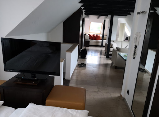Stayed here but didn't actually stay here... The apartment was like a cheerless office on the 5th floor - the lift didn't actually go to the ground floor so a long flight of stairs before you get to the two man lift.||||Bathroom was downstairs with kitchenette and a desk. That was it. Then up a flight of the narrowest steepest steps you can imagine with a built in height hazard halfway to the bedroom which had the largest TV left in western Europe.. If this was the last hotel room left in Dusseldorf then it might be worth considering but other than that give it a miss||||The girl who checked us in initially was ok but the guy on duty at the weekend had that typical attitude that Germans seem to think is businesslike but only comes across as condescending, charmless and unhelpful.. They must be specially trained somewhere as Germans in general don't behave like this.||||and the area around it is seriously dodgy and not suitable for...