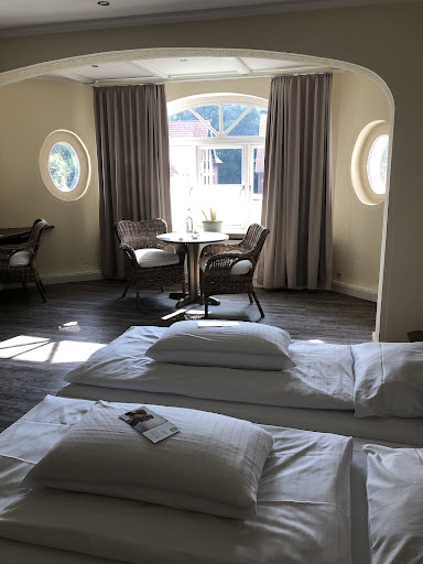 We stayed here for 4 nights. |This place is neither a hotel nor a holiday apartment but consists of several rooms without the typical advantages a hotel has to offer like cleaning or receiving clean towels on a daily basis. We had two rooms plus bath. |The adult room is quite spacious and has a table with 4 seats. In this room there is a closet which has a sink, a refrigerator and a few kitchen appliances like a Tassimo coffee machine. Tip: bring your own pads with you or pay 50ct at the place. ||The good:|1. Small terrace with a "strandkorb"|2. Good location. Walking distance to the centre and sea. |3. Quite. I can't understand a reviewer complaining about the noise from other guests. We didn't hear anyone eventhough the place was fully booked.|4. A free daily newspaper||The bad:|1. The remote from the TV didn't work properly|2. The doors didn't close easily|3. Impossible to get your towels/swim gear dry. Tip for the owner: install something on the terrace to dry things. |4. Mattress very soft. I prefer hard ones.|5. Blankets are too thin so I was cold during the night. Ask for an additional blanket and they will bring you one. ||The...