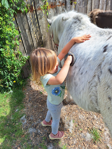 Highlight ist die wochentägliche Stallzeit mit Oma Mültner, die den Kindern mit ihrer ganz eigenen liebevollen Art den Umgang mit den Hoftieren näher bringt. Es wird ausgemistet, frisches Stroh und Heu eingestreut, dann wird der Mist aus der Stallgasse mit einer uralten strombetriebenen Schiebekonstruktion nach draussen auf den Haufen bewegt und die Kinder dürfen die Knöpfe drücken. Danach werden Katzen, Hasen und Meerschweinchen gefüttert, die frisch gelegten Eier aus dem Hühnerhaus geholt, und abschließend werden die 2 Ponys und 2 Esel von der Weide geführt, geputzt, und jeder darf eine Runde geführt reiten. Man sollte einen passenden Fahrradhelm mitbringen.