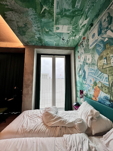 First and foremost, the rooms at this hotel are absolutely gorgeous. The design and colors chosen create a soothing atmosphere that makes it incredibly cozy to stay in. The attention to detail in the room's decor is impressive, rooms feature colorful wallpaper that displays banknotes and different currencies from around the world. And it's evident that the hotel takes great pride in providing guests with a comfortable and aesthetically pleasing environment.