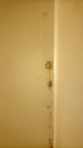 Once I returned, and remade the bed with the now clean linens, I went to shower only to notice the moldy waterspots where the wall meets the ceiling, and the strange substance on the wall next to the sink.