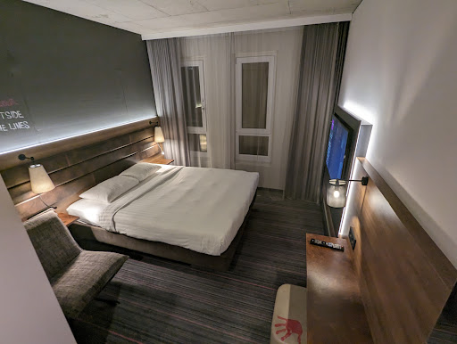 Read moreSo this is your typical 'trendy' Moxy.|It's just on the edge of Frankfurt on a main Road (which also has a Tram Line). It costs about €30 in an Uber from the Airport.|It's weekday Room rate is not bad, Corp Rate was about €120/night, including Breakfast.|So the hotel has a great funky decor, lots of 'odd' items to look at, quite a cool eclectic mix of 'nick-nacks' 😎|The main Reception also acts as a large Bar area with plenty of seats, they also serve decent German Beer 👍.|The Bar area also doubles up as a Breakfast area in the morning. There is also an area where you can work👍, and an 'on site' Barbers?? 😵💫|The Bedrooms are okay, not massive but not too small, they have Air-cons, but more importantly, they have windows that open 🙂👍|The beds are okay, I got an average sleep whilst staying there. The rooms do lack from ANY form of Clothes storage, which I found weird👎. I am not looking for lots of Wardrobes or Chest-of-Drawers, but providing just THREE Hangers on a Coat Hook is just Rubbish! 💩 Even other 'discount' Hotel chains (that don't provide actual Wardrobes) at least have a 'Rail' / 'Shelf' to hang up/place clothes 🫤|One other 'big miss' is the Shower, it is well designed but it has basic 'Mixer' handle, it's not Thermostatically controlled, so water constantly changes from hot to cold (based on other Guests water usage 🤦♂️) also if you knock the handle whilst showering (really easily done) you can then scold 🔥 or freeze yourself ❄️👎👎.|Overall it's quite a good hotel, if they fix a few other small design problems, I'd happily give...