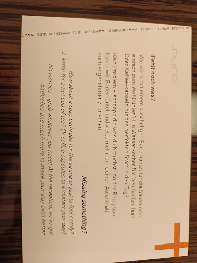 Read moreI stayed at The Pure in Frankfurt for 5 nights and enjoyed my experience. The hotel is conveniently located near the Hauptbahnhof and I was easily able to walk there for food (brötchen, sandwiches, and good asian takeaway). Although the area is inner-city rough, I did not have any problems and encountered many others (male, female, and couples) walking around safely. My room was on the 4th floor with elevator service. It was small but very efficient with a comfortable king or queen size bed and large desk space including a nice raised area to place an open suitcase. The bathroom had a great shower/tub and was standard size. One thing I really liked was that the hotel gives an option to not have daily service in return for a 5 Euro daily credit. I took advantage of this and enjoyed a nice latte from the bar daily. The hotel also has a small fitness/gym & sauna area in the basement. The equipment was good quality and in top condition, and there were also some free weights, towel service, and two TV's. |All in all, my stay was really good, and hotel staff was super friendly and accomodating. I did not have the German style power adapter and the front desk staff was very accomodating and let me borrow one for a 5 Euro deposit. They recognized me every day and were always super courteous and...