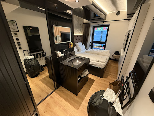 Wir hatten ein „Klassik“-Zimmer. Die Zimmergröße löst Beklemmungen aus, komplett in schwarz gehalten, es passt ein Bett (1,80) rein, rechts und links vom Bett noch 40cm Platz. Dazu noch ein Waschbecken im Zimmer, Toilette und Dusche durch (schwarz gefärbte) Glasscheibe abgetrennt. Man kann also den Partner beim Toilettengang beobachten, das muss man auch mögen. Es ist nicht einmal ein Haken fürs Handtuch oder irgendeine Art Ablage in der Dusche bei dem modernen Design vorgesehen. Topp dafür: die Pflegeprodukte von rituals in den Spendern.