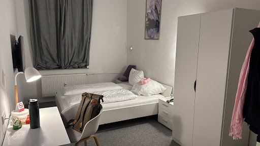 Die Zimmer sind funktional eingerichtet mit Schrank, Schreibtisch, Doppelbett und eigenem Kühlschrank. Besonders gut gefällt mir, dass die Fenster sich komplett öffnen lassen und sowohl Rollos als auch Vorhänge zum Abdunkeln vorhanden sind. Das Badezimmer ist großzügig geschnitten, mit Dusche und Toilette gut ausgestattet und modern eingerichtet. Eine Gemeinschaftsküche bietet die Möglichkeit, Speisen aufzuwärmen.