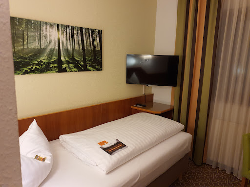 Read moreThis hotel is located in a quiet courtyard off a main street, is a short walk to tram, post office and a couple of little restaurants. The lobby is up one outside flight of stairs, and an elevator up another 4 or so steps. There is a morning breakfast room at extra cost which we did not use, and there is a full bar which the office clerk manned when needed. The room is clean, 50s-ish with built-in style headboard and armoire, nicely made up. The bathtub is round-bottomed and requires an abundance of caution. Otherwise, the front office staff was friendly, efficient, helpful in toting luggage up and down outside steps. The price was right, although it is expected that rates would be much higher during Hannover...