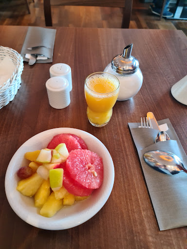 Das Frühstück ist sehr reichhaltig es gibt es große Auswahl von Kaffee, Müsli, Kornflakes, frisches Obst, verschiedene Brot und Brötchen, Aufschnitt und Aufstriche. Rührei, Bacon, mini Würstchen und mini Frikadellen. Für die süßen Frühstücker dann Pancakes mit Apfelmus und Schokobrötchen, Honig, Marmeladen usw. usw.