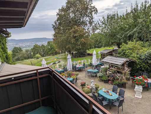 Lage sehr schön, aber den Ausblick hat man von drinnen nicht, sondern schaut auf viel gemischte Deko von Wild-, Jagdutensilien bis hin zu Ostereier ... überfüllt!