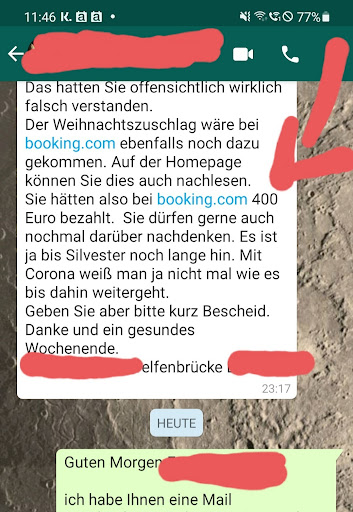 Konkreter Fall: Nach meiner Buchung auf booking. com wurde ich von den Eigentümern telefonisch kontaktiert, ob ich die Buchung nicht stornieren möchte und direkt über Ihre Homepage buchen, da ich dann sparen würde, da Gebühren wegfallen würden und ich einen Weihnachtsbonus erhalten würde (es ging um eine Ersparnis von 30 Euro pro Nacht). Als ich daraufhin auf der Homepage buchte, betrug die Ersparnis lediglich 20 Euro insgesamt und es war die Rede von einem Weihnachtszuschlag. Als ich daraufhin nachfragte, wurde mir gesagt, ich hätte das im Telefonat falsch verstanden. Auch, dass ich bei booking.com ja eigentlich auch mehr bezahlt hätte, als in meiner Rechnung stand. Aha? Ich buche regelmäßig über booking.com und musste noch nie mehr bezahlen, als in der Rechnung stand. Sehr schade, wie es gelaufen ist. Ich habe die Buchung storniert.