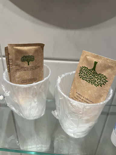 Im Bad war es auch nicht wirklich umweltfreundlich. Plastikbecher, eingehüllt in Plastik. Darin waren jeweils 2 kleine Proben von Shampoo/Duschgel-Gemisch, die nicht gereicht hätten, wenn man sie hätte benutzen müssen.