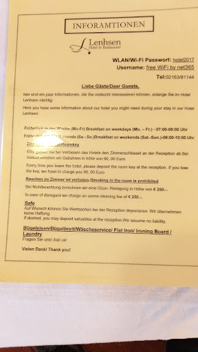 I stayed at the Hotel Restaurant Lenhsen for four nights in Aug 2009. The hotel was easy to find (with Sat Nav) and had a good sized car park. It is a small, family run hotel with a small resturant downstairs. It serves typical German food (the menu is not translated so dinner was always entertaining!) and prices, quality and value are all reasonable. Drinks can be quite pricey though! During my stay, the hotel was popular with Germans, Belgians and Austrians and the hotel, restuarnt & service seemed to cater for a more European taste.||||I was one of several guests at the hotel who had travelled for our friend's wedding, and we did find that we were given a variety of 'deals' according to how we booked. I rang the hotel directly, and it appears I got the best room & price - others paid up to double for the same size room when booking through third parties/agents, so I would recommend contacting the hotel yourself! ||||My room was a good size and as a single booking, I had a room with two twin beds and a cot. The shower was lovely, and the bathroom was small, but well equipt. The room was always immaculately clean and well serviced. ||||I would recommend this hotel, as long as you are lookin for a basic but comfortable stay - the hotel were happy to accomdate our 'comings and goings' and were flexible with check in/out times according to flights, but it is certainly not a...