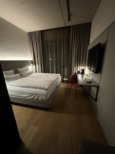 Friendly staff, brand new building and easy parking access. What the actual design statement is, remains unclear. For a fact it’s comfortable and well furnished. The rooms have a fairly standard layout and sizing . nothing special to it to justify the design claim or would it be for the open bathroom, which to me is simply ridiculous. Beds are too hard to be comfortable, which obviously is personal. Shout out to the XXL flatscreen with casting option. Breakfast was alright, but not amazing. Bar staff was flirting and drinking alcohol, which was cute but unprofessional. Overall good experience but too expensive really. 170€ is just not right. Can recommend at significant lower...