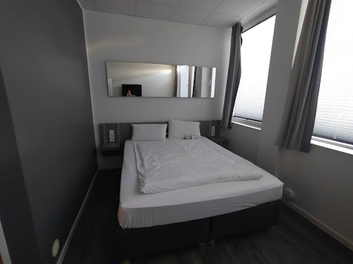 This hotel (really a motel) aims to strip away everything you don't need so that you pay only for what you do need. It achieves its goal. My single room was clean and functional, and I had a free place to park my car, but there was no reception desk and no human on duty when I arrived around midnight. I got my room key from an automated kiosk. In-room wifi worked well enough, but it was configured to detect and prevent streaming videos. ||||The room design might be called prison cell chic, but it also reminded me strongly of a dorm room. There was a single bed, a chair, a work surface, a standing fan, and a sink in the room. The toilet was in one closet-like alcove, and the shower in another. Linens consisted of one bath towel and what was presumably a bathmat. ||||If all you're looking for is a clean, safe, inexpensive place to sleep, this hotel is a great choice. If you're expecting more, you'll be...