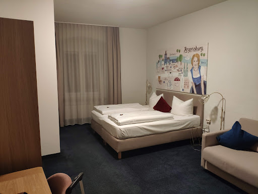 Read moreExactly what we needed. Just a one night stay in Regensburg and only a minutes walk into the centre. We wanted somewhere with secure parking for hubbys car. Easy to pull up outside the hotel to take luggage in for a quick check in and then to get to their own parking garage it was a case of left, left, left! Steps up to reception and then elevator to other floors, I think there was an elevator to the first floor but did not find it. The people on reception were extremely helpful and very welcoming. They even offered a free welcome drink, beer, wine, Prosecco which was a nice touch. Our room was 214 and overlooking a side street above the main entrance. We had no problem with street noise as only a small side street but to be fair it did throw it down the night we were staying so not many people about and it was also mid week. You could sleep with the window shut as they had air conditioning which was actually switched on and working. The room was not the poshest we have ever stayed in but very clean, nicely done, the bed comfortable, the odd item in the bathroom could have done with an update but absolutely fine. They even had tea and coffee making in the room. The shower was powerful. Breakfast was very good with coffee machine for cappuccino etc, nice breads, hams, cheese etc. you can leave your luggage if checking out of your room but wanting to explore the city for a few hours more.If you are wanting a few nights stay in Regensburg and secure parking, would...
