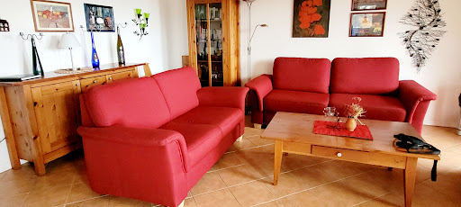 Die Inneneinrichtung zeigte sich ähnlich der ersten äußeren Erscheinung. Dekogegenstände sind geschmacklos kombiniert, ein defekter Fussabtreter ziert den Weg zur Terrasse und stellt sich als Unfallquelle zur Verfügung, Bilder an der Wand die überhaupt nicht zum Rest passen.... Die große Wohnküche, mit Kamin und 2 Sofa war noch der beste Ort im Haus. Der Fernseher ist mit ca. 80 cm Diagonale.