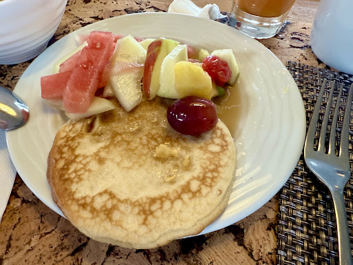 A large display of food is available but pancakes are cold, flat and feel like they have come out of a box and heated by microwave rather than made by a chef. No syrup is in sight but rather some fruit jelly mixture/liquid.