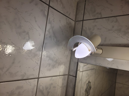 Dann verging uns aber die Romantik. Man muss dazu sagen, ich bin kein typisch Deutscher, der alten Generation. Welche sich über Fusseln im Eck oder auch mal krumme Tapeten aufregen können. Auch das Badschränkchen, aus laminierten Sperrholplatten, das sich unten langsam auflöst, ist für mich kein Grund zu jammern. Allerdings, sollte man im Badezimmer definitiv mal die Klobürste austauschen. Denn diese ist nicht mehr weiss sondern braun. Sowie den Duschvorhang, der übermäßig viele Stockflecken hat. Im Zimmer befindet sich ein Gerät, das für mich wie ein Klimagerät aussah, welches man in die Steckdose stecken kann. Irgendeinem Gast davor scheint irgendwas, da hingespritzt zu sein, und die Lüftungsschlitze sind doch auch schon recht schwarz. Könnte man reinigen. Scheint auch nicht schwer weg zu gehen, habs mit Klopapier und Wasser getestet. Da sollten Reiniger und professionelle Putzsachen keine Probleme haben.